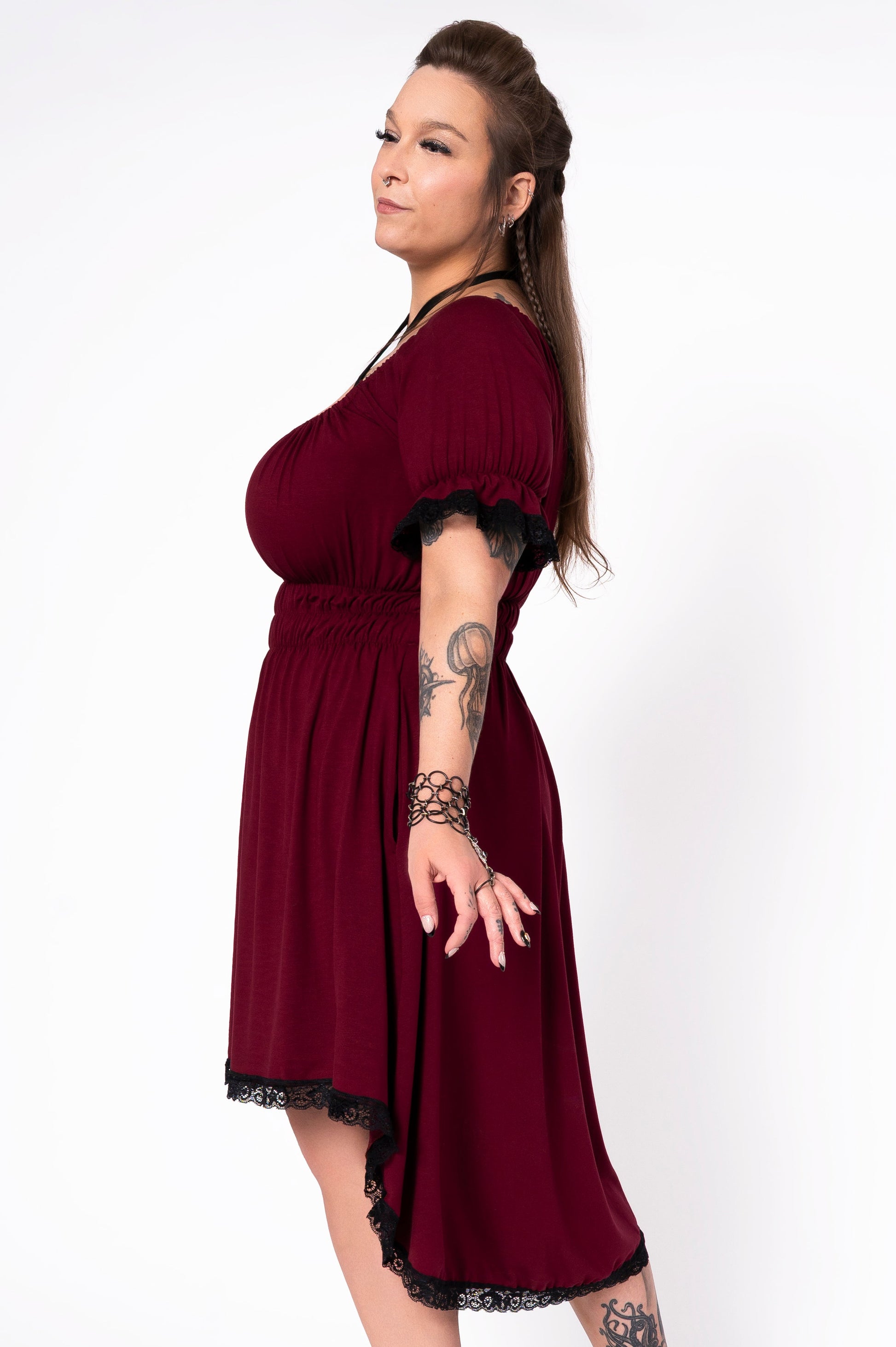 Il y a une dentelle décorative noire aux ourlets des manches et de la jupe. Deux cordons extensibles noirs peuvent être noués au niveau du décolleté et autour du cou.