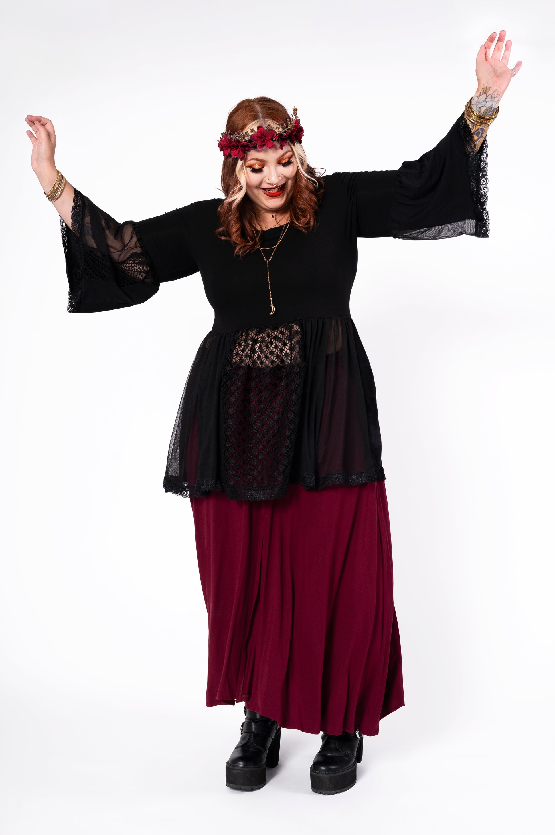 All Chimère tops are one-of-a-kind and may have following type of black fabrics: Velvet, mesh, twill, knit, lace. Some fabrics are see-through. We cannot guarantee which materials you will get.