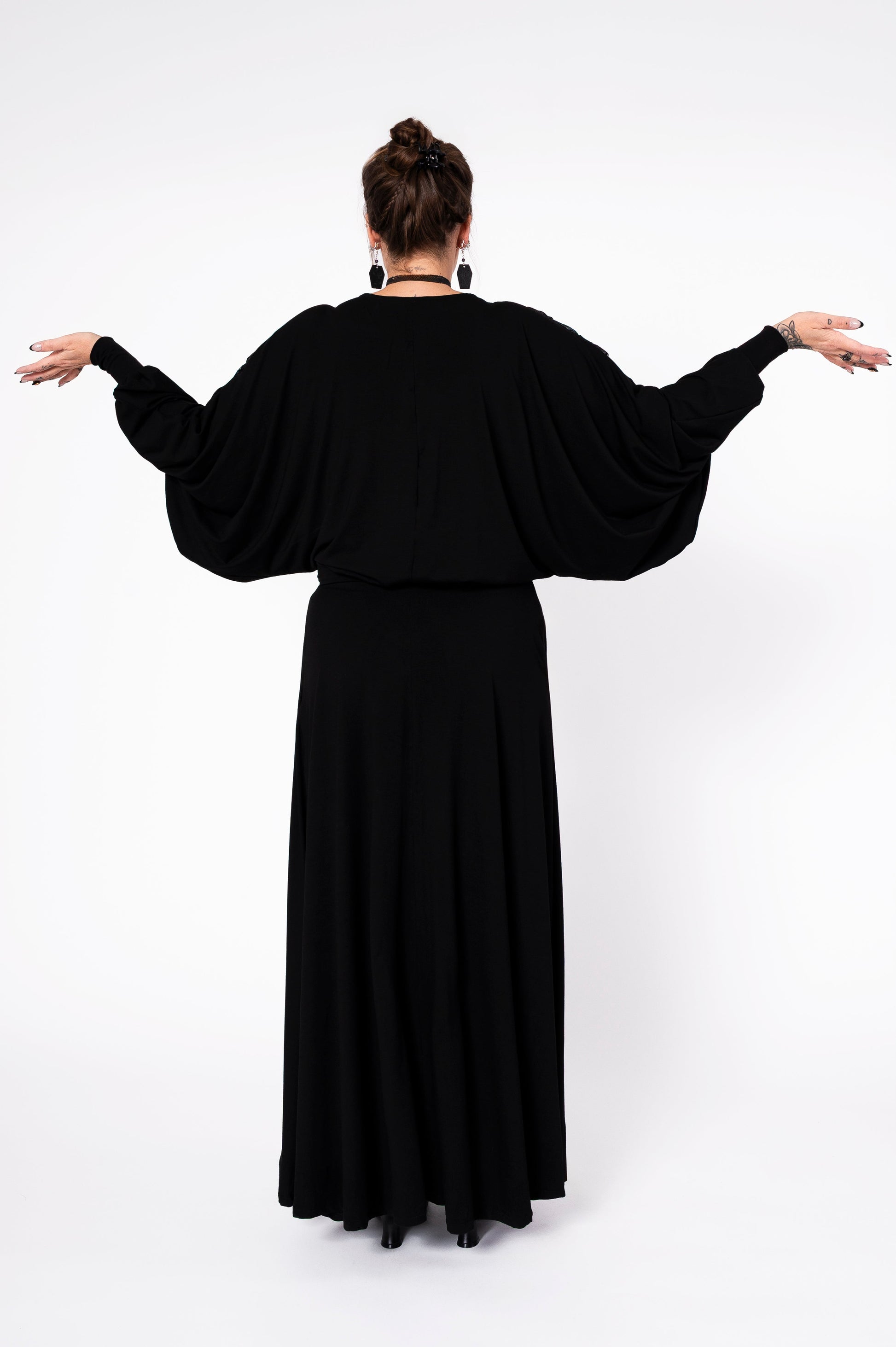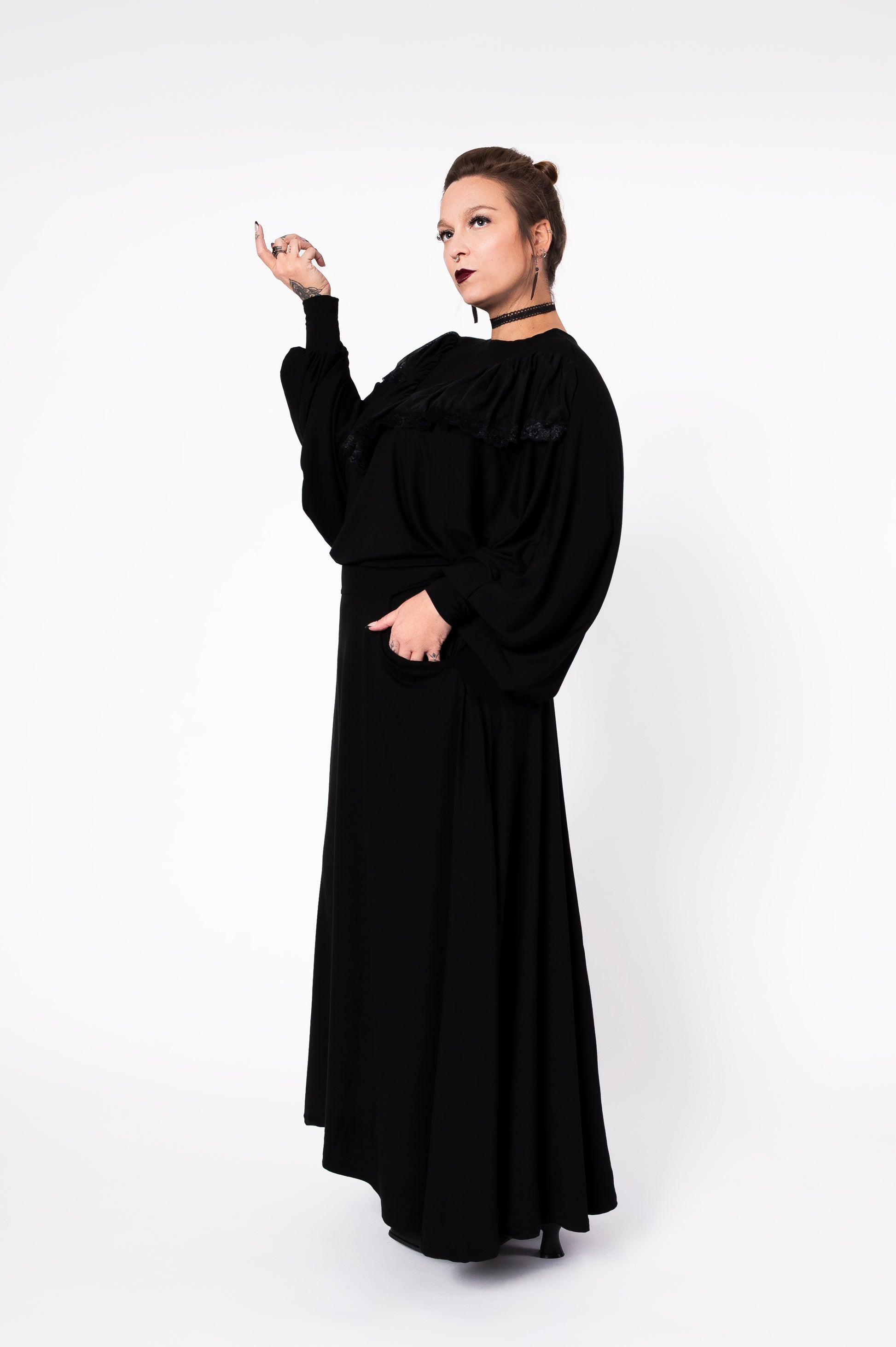 Slip into this exquisite macabre gown. Crafted in premium jersey knit, it has long puffy bat sleeves. You will love the black on black details of the front ruffles, designed in soft mesh and stretch lace.